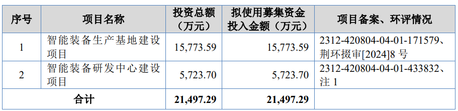 楚大智能原拟募集资金21,497.29万元,用于智能装备生产基地建设项目、智能装备研发中心建设项目。