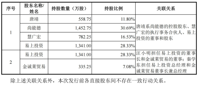 目前,慧谷新材和新莱福的实控人分别为唐靖和汪小明,但易上投资同时是慧谷新材和新莱福的第二大股东,分别持股28.33%和13.72%。同时,截至慧谷新材的招股书签署日,汪小明担任慧谷新材董事,汪小明及其配偶总共直接和间接持有慧谷新材3.56%的股份,而唐靖同样通过易上投资间接持股新莱福。