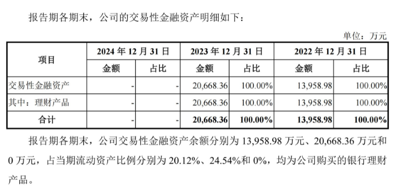 慧谷新材招股书显示,2022年末和2023年末,慧谷新材拥有理财产品分别为1.40亿元和2.07亿元,分别占到当期资产总额的5.94%和21.50%。到了2024年末,慧谷新材的理财产品则降到了0。