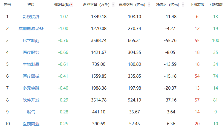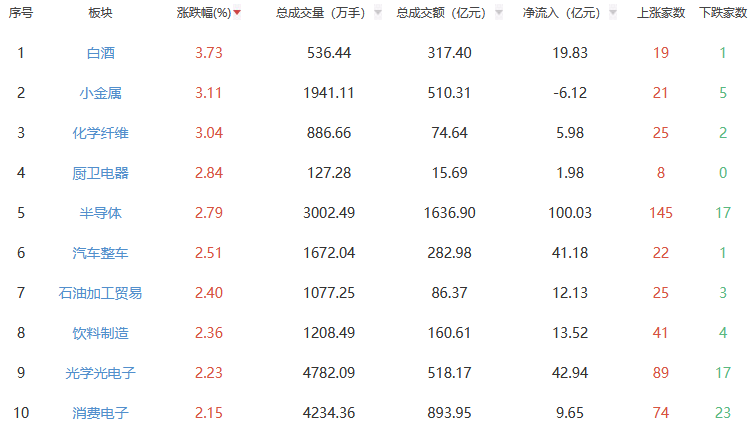 行业板块方面,白酒、小金属、化学纤维等板块涨幅居前,影视院线、其他电源设备、化学制药等板块跌幅居前。