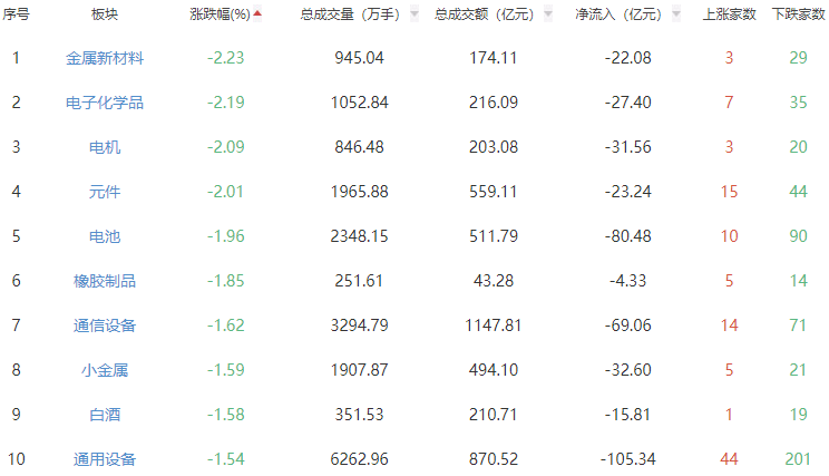 行业板块方面,油气开采及服务、互联网电商、美容护理等板块涨幅居前,金属新材料、电子化学品、电机等板块跌幅居前。