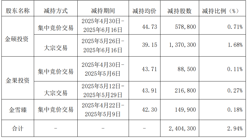 公司6月16日晚披露关于公司实际控制人之一致行动人减持计划实施完毕的公告。近日公司收到公司实际控制人之一致行动人金硕投资、金果投资、金雪臻出具的《关于减持计划实施完毕的告知函》,金硕投资、金果投资、金雪臻合计减持2,404,300股,减持比例2.94%。根据公告计算,金硕投资、金果投资、金雪臻本次减持套现约9926.58万元。根据征和工业此前的公告显示,金硕投资、金果投资系公司员工持股平台,实际控制人之金玉谟为金硕投资的执行事务合伙人,实际控制人之金雪芝为金果投资的执行事务合伙人,金雪臻为公司实际控制人金玉谟的姐姐,与公司实际控制人构成一致行动关系。