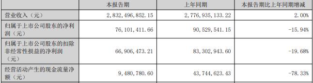 据公司2025年半年报,报告期内,公司实现营业收入28.32亿元,同比增长2.00%;归属于上市公司股东的净利润7610.14万元,同比减少15.94%;扣除非经常性损益后的净利润6690.65万元,同比减少19.68%;经营活动产生的现金流量净额948.08万元,同比减少78.33%。
