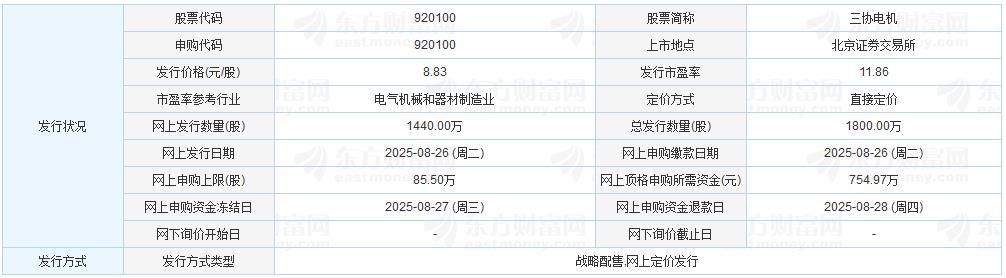 三协电机于2025年8月22日发布的向不特定合格投资者公开发行股票并在北京证券交易所上市发行公告显示,若本次发行成功,超额配售选择权行使前,预计公司募集资金总额为15,894.00万元,扣除发行费用2,802.77万元(不含增值税)后,预计募集资金净额为13,091.23万元。若超额配售选择权全额行使,预计公司募集资金总额为18,278.10万元,扣除发行费用2,802.80万元(不含增值税)后,预计募集资金净额为15,475.30万元。