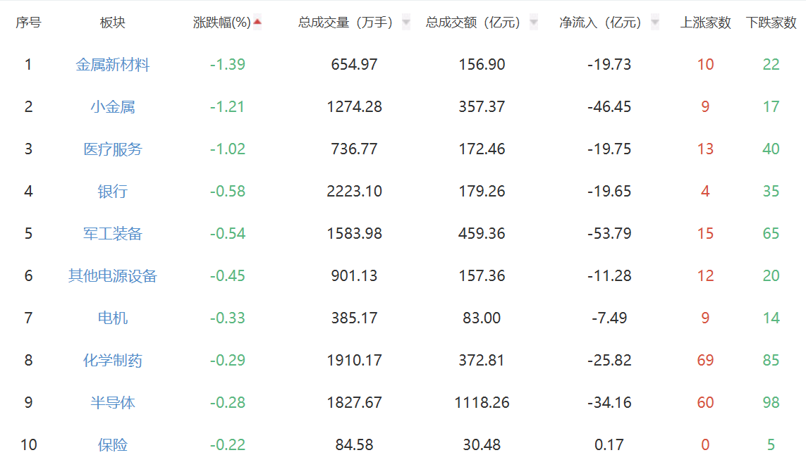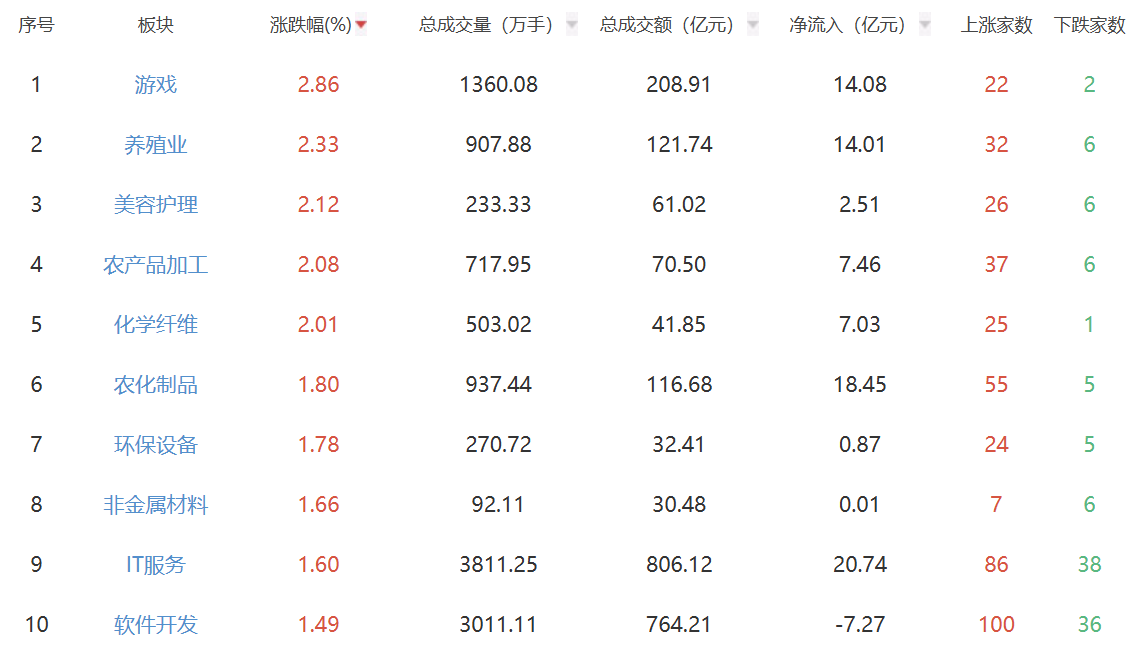 板块方面,游戏、养殖业、美容护理等板块涨幅居前,金属新材料、医疗板块等板块跌幅居前。