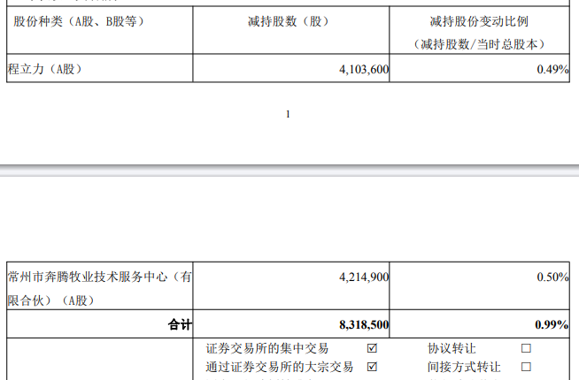 程立力、奔腾牧业于2025年7月30日至2025年8月26日通过大宗交易、集中竞价减持8,318,500股,减持股份变动比例为0.99%。