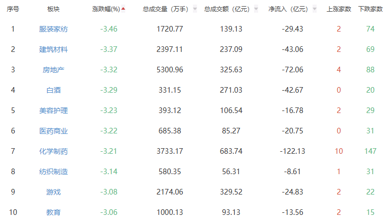 板块方面,其他电源设备、半导体、金属新材料等板块跌幅最小,服装家纺、建筑材料、房地产等板块跌幅居前。