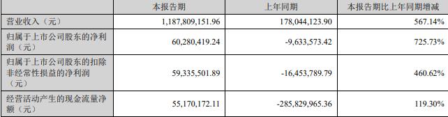 据公司2025年半年报,报告期内,公司实现营业收入11.88亿元,同比增长567.14%;归属于上市公司股东的净利润6028.04万元,同比增长725.73%;扣除非经常性损益后的净利润5933.55万元,同比增长460.62%;经营活动产生的现金流量净额5517.02万元,同比增长119.30%。