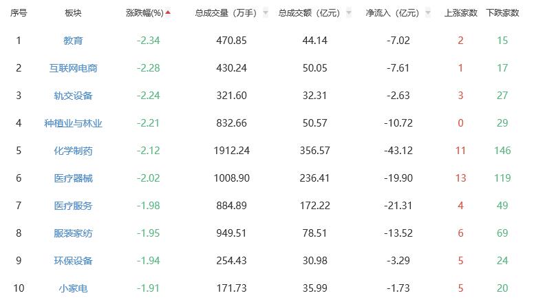板块方面,半导体、通信设备、电子化学品等涨幅居前,教育、互联网电商、轨交设备等跌幅居前。