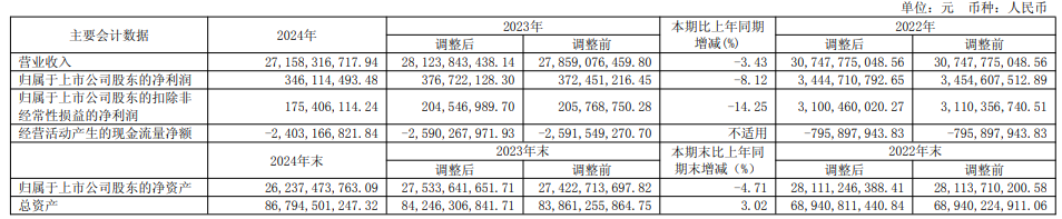 明阳智能2024年年度报告显示,2024年,公司实现营业收入271.58亿元,同比下滑3.43%;归属于上市公司股东的净利润3.46亿元,同比下滑8.12%;归属于上市公司股东的扣除非经常性损益的净利润1.75亿元,同比下滑14.25%;2022年至2024年经营活动产生的现金流量净额为分别为-7.96亿元、-25.90亿元、-24.03亿元。