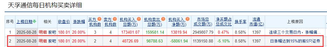龙虎榜数据显示,天孚通信为日涨幅达到15%的前5只证券,买入该股金额最大的前5名中,2家为机构专用席位。卖出该股金额最大的前5名中,4家为机构专用席位。经统计,机构席位今日卖出天孚通信净额为58061.94万元。