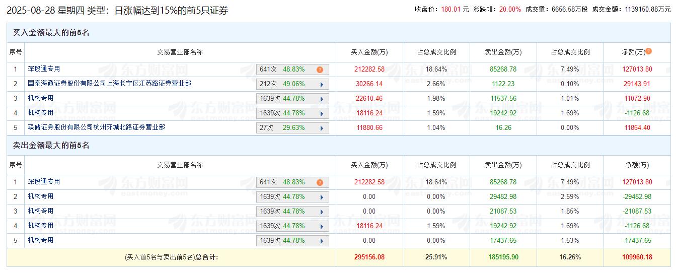 中国经济网北京8月28日讯 天孚通信(300394)今日涨停,截至收盘报180.01元,涨幅20.00%。