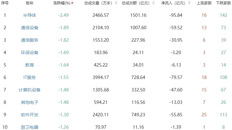 板块方面,电池、小金属、保险等板块涨幅居前,半导体、通信设备、通信服务等板块跌幅居前。