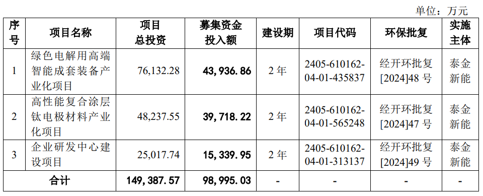 泰金新能拟募集资金98,995.03万元,用于绿色电解用高端智能成套装备产业化项目、高性能复合涂层钛电极材料产业化项目、企业研发中心建设项目。