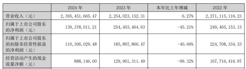 2024年,赛意信息实现营业总收入23.95亿元,同比增长6.27%;归母净利润1.39亿元,同比下降45.21%;扣非净利润1.1亿元,同比下降40.66%;经营活动产生的现金流量净额为88.81万元,同比下降99.32%。