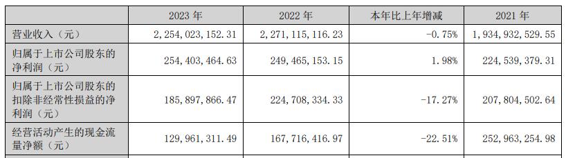2023年,赛意信息实现营业总收入22.54亿元,同比下降0.75%;归母净利润2.54亿元,同比增长1.98%;扣非净利润1.86亿元,同比下降17.27%;经营活动产生的现金流量净额为1.30亿元,同比下降22.51%。