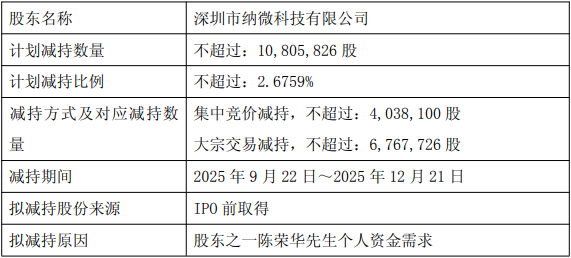 其中,集中竞价减持公司股份不超过4,038,100股,大宗交易减持公司股份不超过6,767,726股。本次减持计划为深圳纳微股东之一陈荣华根据个人资金需求减持间接持有的公司股份,公司实际控制人、董事长江必旺博士不减持公司股份。