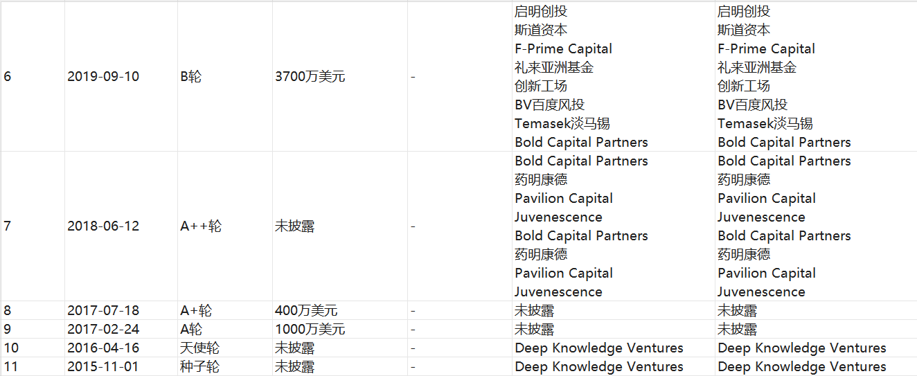 英矽智能2019年9月进行了B轮融资,投资方包括启明创投、斯道资本、F-Prime Capital、礼来亚洲基金、创新工场、BV百度风投、Temasek淡马锡、Bold Capital Partners等机构,融资规模为3700万美元。