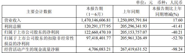 据公司2025年半年报,报告期内,公司实现营业收入14.70亿元,同比增长17.60%;归属于上市公司股东的净利润1.23亿元,同比减少40.21%;扣除非经常性损益后的净利润9741.84万元,同比减少52.70%;经营活动产生的现金流量净额470.61万元,同比减少98.24%。