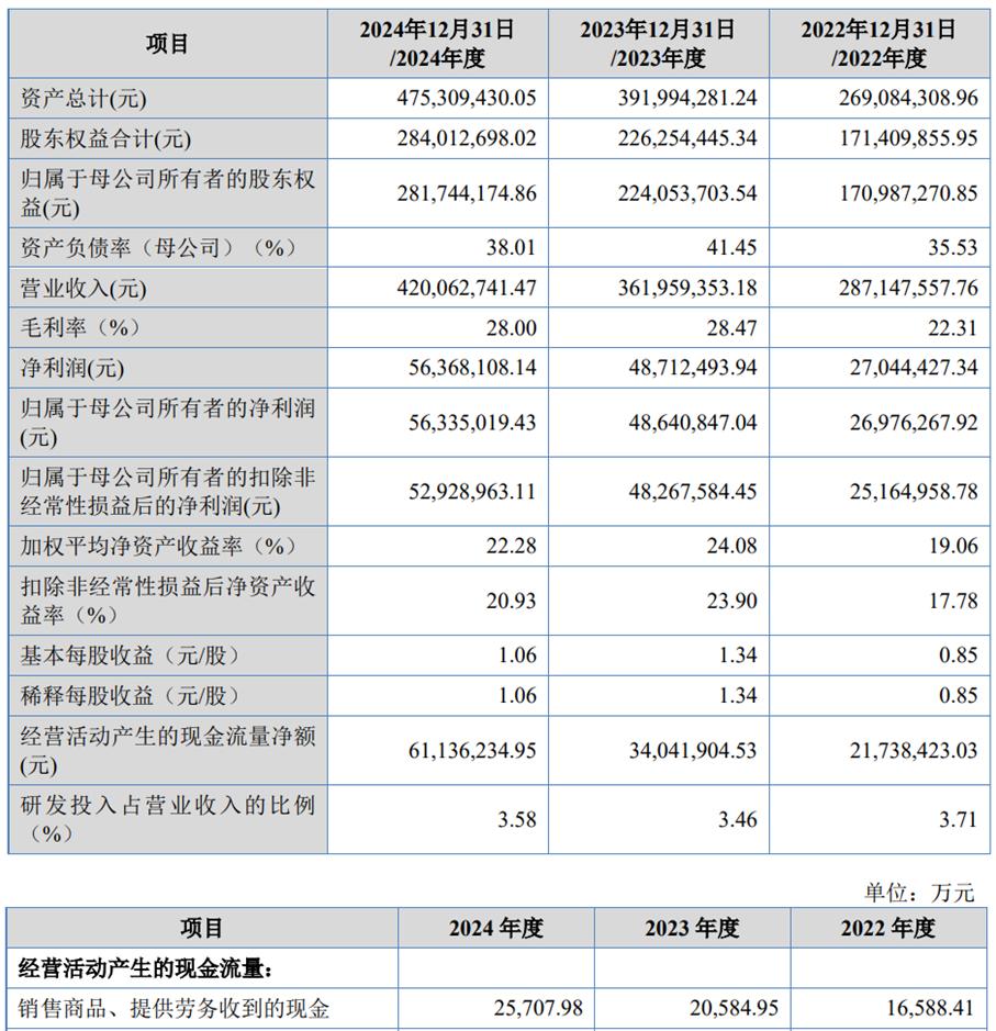 2022年至2024年,三协电机的营业收入分别为28,714.76万元、36,195.94万元和42,006.27万元;净利润分别为2,704.44万元、4,871.25万元和5,636.81万元;归属于母公司所有者的净利润分别为2,697.63万元、4,864.08万元和5,633.50万元;归属于母公司所有者的扣非净利润分别为2,516.50万元、4,826.76万元和5,292.90万元。