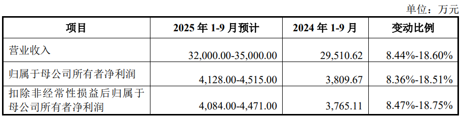 公司预计2025年1-9月营业收入约为32,000.00万元至35,000.00万元,同比增长幅度约为8.44%至18.60%;归属于母公司所有者的净利润约为4,128.00万元至4,515.00万元,同比增长幅度约为8.36%至18.51%;归属于母公司所有者的扣除非经常性损益后的净利润约为4,084.00万元至4,471.00万元,同比增长幅度约为8.47%至18.75%。