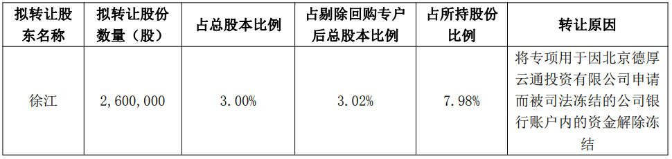 徐江委托中国国际金融股份有限公司(以下简称“中金公司”)组织实施本次询价转让。公告显示,本次转让扣除相关税费后的资金净额,将专项用于因北京德厚云通投资有限公司申请而被司法冻结的公司银行账户内的资金解除冻结。