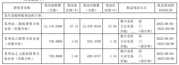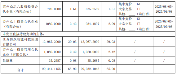 2025年8月4日至2025年9月8日,上述信息披露义务人通过集中竞价交易方式减持博众精工股份4,090,107股,占公司总股本的0.92%。本次权益变动后,公司控股股东及其一致行动人持有公司股份数量由294,411,155股减少至290,321,048股,占公司总股本比例由65.92%减少至65.00%,触及5%的整数倍。