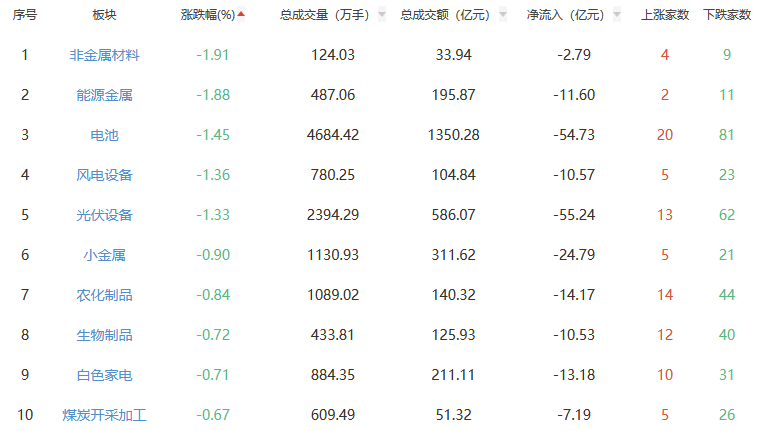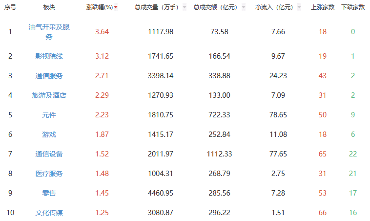 行业板块方面,油气开采及服务、影视院线、通信服务等板块涨幅居前,非金属材料、能源金属、电池等板块跌幅居前。