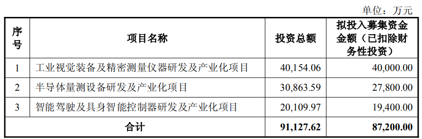 天准科技2025年8月9日披露的向不特定对象发行可转换公司债券预案(修订稿)显示,本次拟发行可转换公司债券总额不超过人民币87,200.00万元(含87,200.00万元),扣除发行费用后拟用于工业视觉装备及精密测量仪器研发及产业化项目、半导体量测设备研发及产业化项目、智能驾驶及具身智能控制器研发及产业化项目。