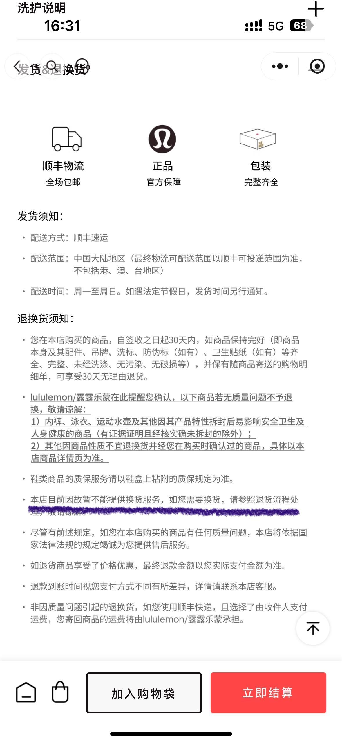 记者查询lululemon官方小程序发现,其页面明确标注“本店目前因故暂不能提供换货服务,如您需要换货,请参照退货流程处理”。