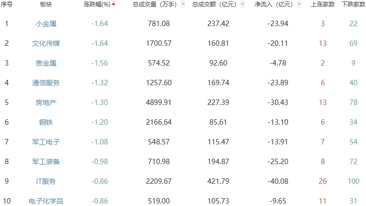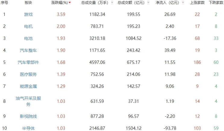 板块方面,游戏、电机、电池等板块涨幅居前,小金属、文化传媒、贵金属等板块跌幅居前。
