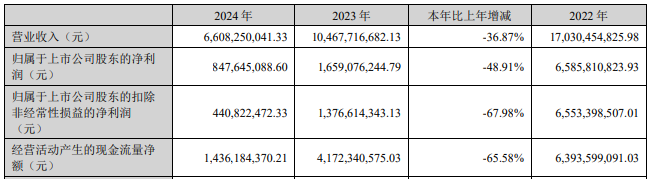 2024年,天华新能营业收入为66.08亿元,同比下降36.87%;归属于上市公司股东的净利润8.48亿元,同比下降48.91%;归属于上市公司股东的扣除非经常性损益的净利润4.41亿元,同比下降67.98%;经营活动产生的现金流量净额14.36亿元,同比下降65.58%。