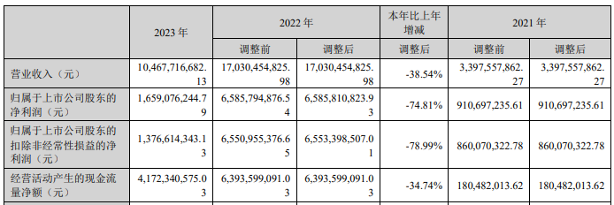 2023年,天华新能营业收入为104.68亿元,同比下降38.54%;归属于上市公司股东的净利润16.59亿元,同比下降74.81%;归属于上市公司股东的扣除非经常性损益的净利润13.77亿元,同比下降78.99%;经营活动产生的现金流量净额41.72亿元,同比下降34.74%。