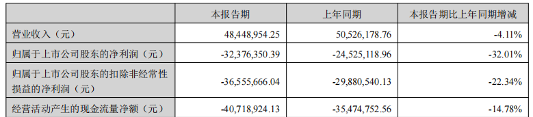 2024年,公司实现营业收入1.34亿元,同比下降17.65%;实现归属于上市公司股东的净利润-5078.03万元,上年为-4018.93万元;实现归属于上市公司股东的扣除非经常性损益的净利润-6249.51万元,上年为-5362.66万元;经营活动产生的现金流量净额为-3242.21万元,上年为-2894.86万元。
