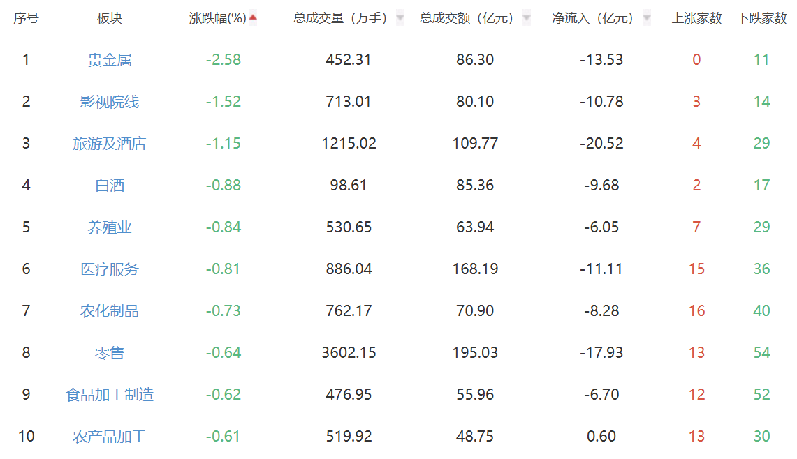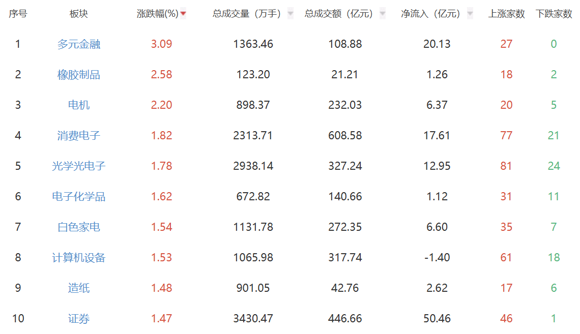 板块方面,多元金融、橡胶制品、电机等板块涨幅居前,贵金属、影视院线等板块跌幅居前。