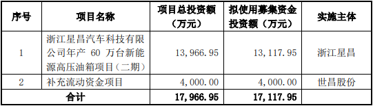 世昌股份最终募集资金净额较原计划少2173.54万元。世昌股份2025年9月5日发布的招股说明书显示,公司拟募集资金17,117.95万元,分别用于浙江星昌汽车科技有限公司年产60万台新能源高压油箱项目(二期)、补充流动资金项目。