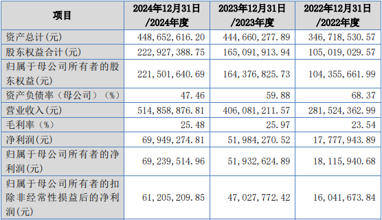 2022年、2023年和2024年,公司营业收入分别为28,152.44万元、40,608.12万元和51,485.89万元;净利润分别为1,777.79万元、5,198.43万元和6,994.93万元;归属于母公司所有者的净利润分别为1,811.59万元、5,193.26万元和6,923.95万元;扣除非经常性损益后归属于母公司所有者净利润分别为1,604.17万元、4,702.78万元和6,120.52万元。