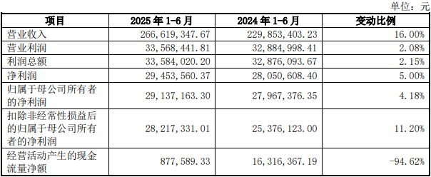 2025年1-6月,公司营业收入为26,661.93万元,同比增长16.00%;归属于母公司所有者的净利润较2,913.72万元,同比增长4.18%;扣除非经常性损益后的归属于母公司所有者的净利润2,821.73万元,同比增长11.20%;经营活动产生的现金流量净额87.76万元,同比减少94.62%。