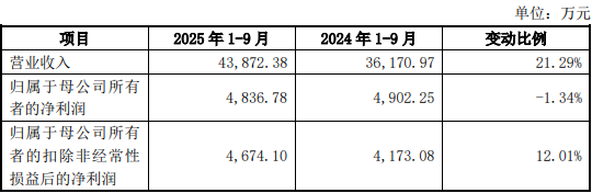 2025年1-9月,公司预计实现营业收入43,872.38万元,同比增长21.29%;预计实现归属于母公司所有者的净利润4,836.78万元,同比减少-1.34%;实现归属于母公司所有者的扣除非经常性损益后的净利润4,674.10万元,同比增长12.01%。