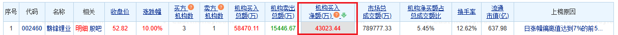 龙虎榜数据显示,赣锋锂业买入金额最大的前五名中,有3家机构专用席位;卖出金额最大的前五名中,有1家机构专用席位。经统计,赣锋锂业的机构席位今日净买入金额为43023.44万元。