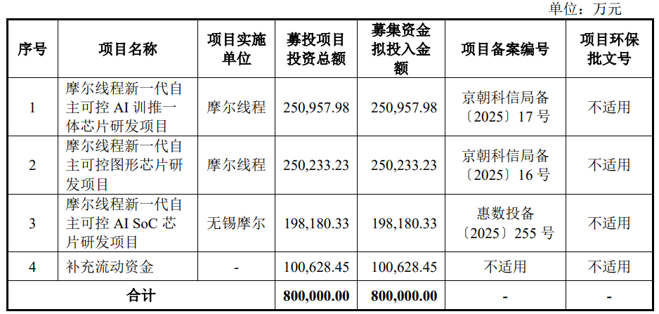 招股书显示,摩尔线程拟募集资金800,000.00万元,用于摩尔线程新一代自主可控AI训推一体芯片研发项目、摩尔线程新一代自主可控图形芯片研发项目、摩尔线程新一代自主可控AISoC芯片研发项目、补充流动资金。