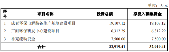 三耐环保原拟募集资金32,919.41万元,计划用于成套环保电解装备生产基地建设项目、三耐环保研发中心建设项目、补充流动资金。