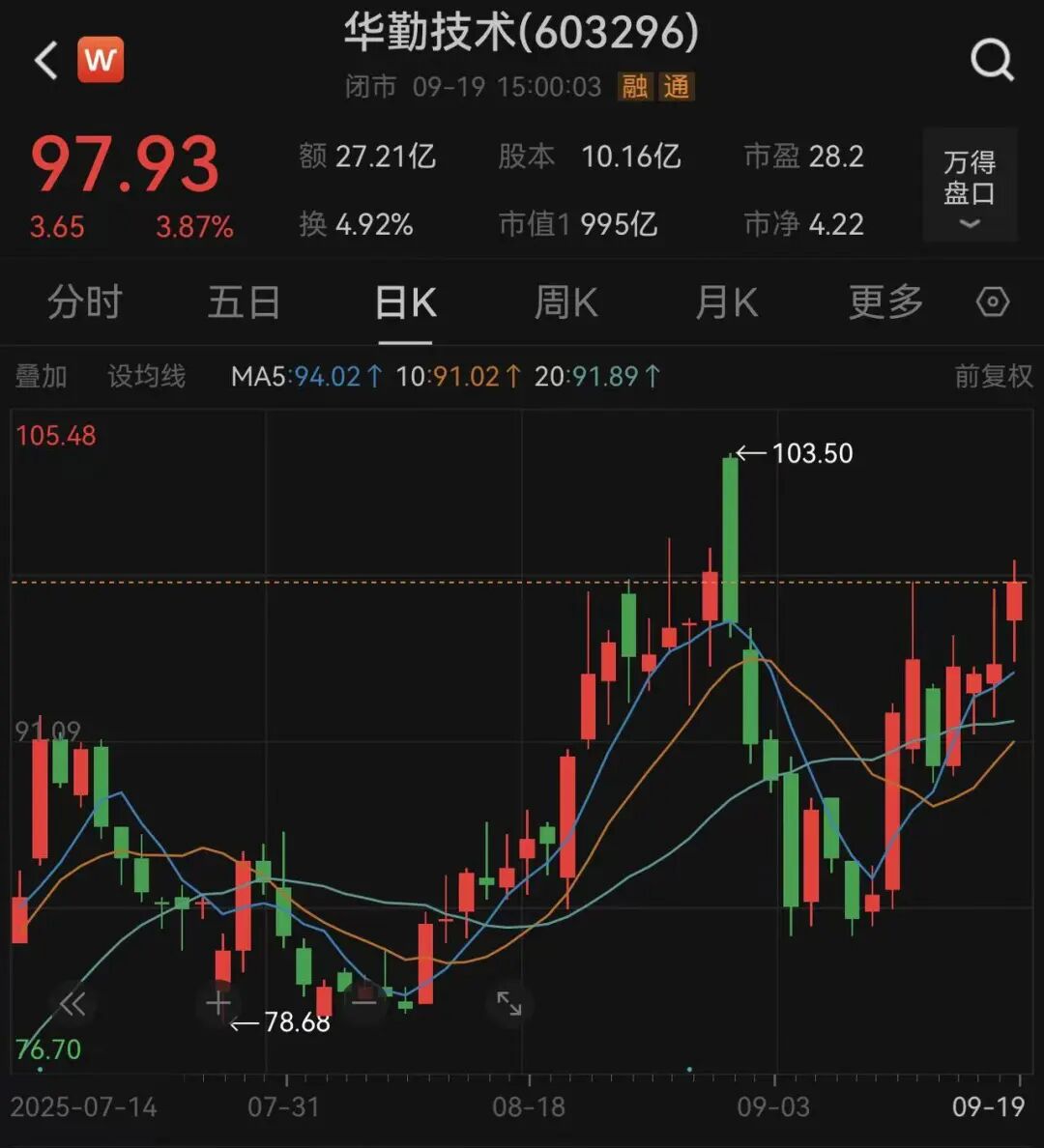 行情数据显示,华勤技术A股IPO发行价为80.8元/股,上市后公司股价经历了近一年的震荡下行,并在2024年9月9日盘中触及42.84元/股(不复权,下同)的历史低点。此后,华勤技术股价开始反弹,并在今年2月下旬触及105.98元/股的历史高点。9月18日,华勤技术股价报收于94.28元/股,较发行价上涨16.68%。截至9月19日收盘,华勤技术股价涨3.87%,报97.93元/股,最新市值995亿元。