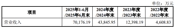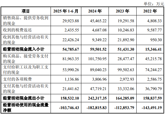 2022年至2024年及2025年上半年,摩尔线程营业收入分别为4,608.83万元、12,398.19万元、43,845.95万元、70,176.19万元,销售商品、提供劳务收到的现金分别为4,808.33万元、19,291.58万元、45,465.22万元、29,923.88万元。