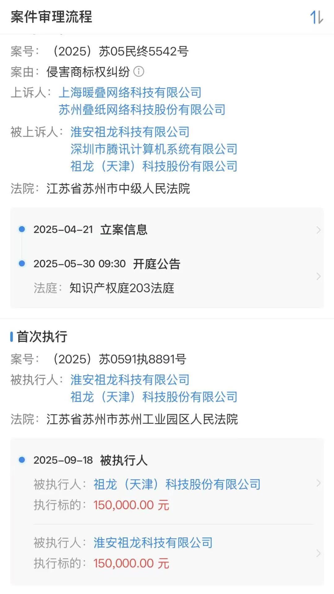 记者从知情人士处获悉,该案终审结果为,江苏省中级人民法院判决维持一审判决,认定祖龙构成商标侵权及不正当竞争,判令其向叠纸赔偿经济损失及合理开支共计15万元。后祖龙因到期未履行,被申请强制执行。另外,祖龙后续诉叠纸的其中一起诉讼也已于2025年9月主动撤诉。