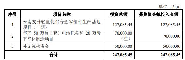公司最终募集资金净额比原计划少39337.36万元。友升股份2025年9月18日发布的首次公开发行股票并在主板上市招股说明书显示,公司拟募集资金247,085.45万元,用于云南友升轻量化铝合金零部件生产基地项目(一期)、年产50万台(套)电池托盘和20万套下车体制造项目、补充流动资金。