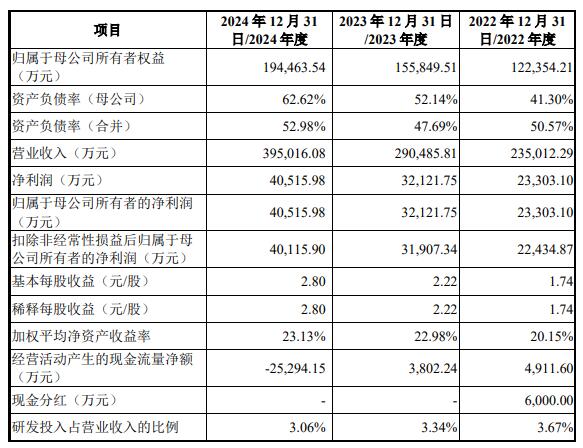 2022年、2023年、2024年,友升股份实现营业收入分别为235,012.29万元、290,485.81万元、395,016.08万元;归属于母公司所有者的净利润分别为23,303.10万元、32,121.75万元、40,515.98万元;扣除非经常性损益后归属于母公司所有者的净利润分别为22,434.87万元、31,907.34万元、40,115.90万元。