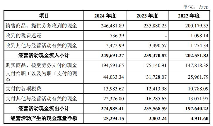 2022年、2023年、2024年,友升股份销售商品、提供劳务收到的现金分别为200,179.35万元、235,880.25万元、246,481.89万元;经营活动产生的现金流量净额分别为4,911.60万元、3,802.24万元、-25,294.15万元。