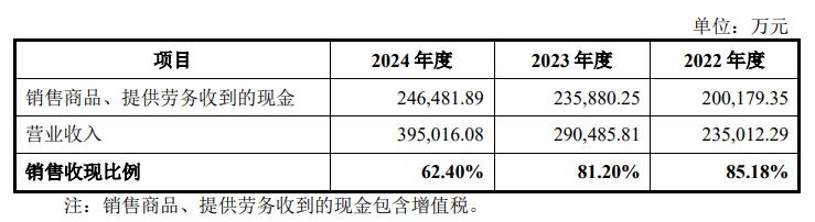 友升股份表示,报告期内,公司销售收现比例分别为85.18%、81.20%和62.40%,报告期内收现比较低,主要系公司部分销售以银行承兑汇票结算。公司收到的银行承兑汇票会进行贴现、背书,使得销售商品收到的现金减少。2023年度销售收现比例下降主要系票据结算占比增多,导致收现比例下降。2024年度销售收现比例进一步下降,主要系票据结算增加的背景下,公司将宁德时代等客户支付的票据进行贴现,相关现金流量计入筹资活动。