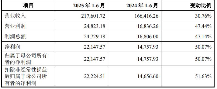 2025年上半年,友升股份实现营业收入217,601.72万元,同比增长30.76%;归属于母公司所有者的净利润22,147.57万元,同比增长50.07%;扣除非经常性损益后归属于母公司所有者的净利润22,224.51万元,同比增长51.63%。